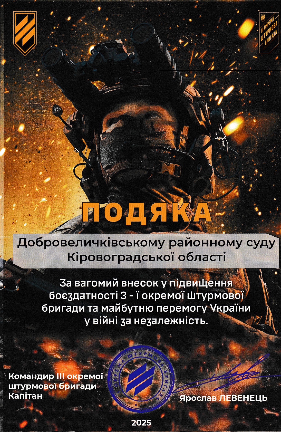 Добровеличківський районний суд Кіровоградської області отримав подяку від третьої штурмової бригади