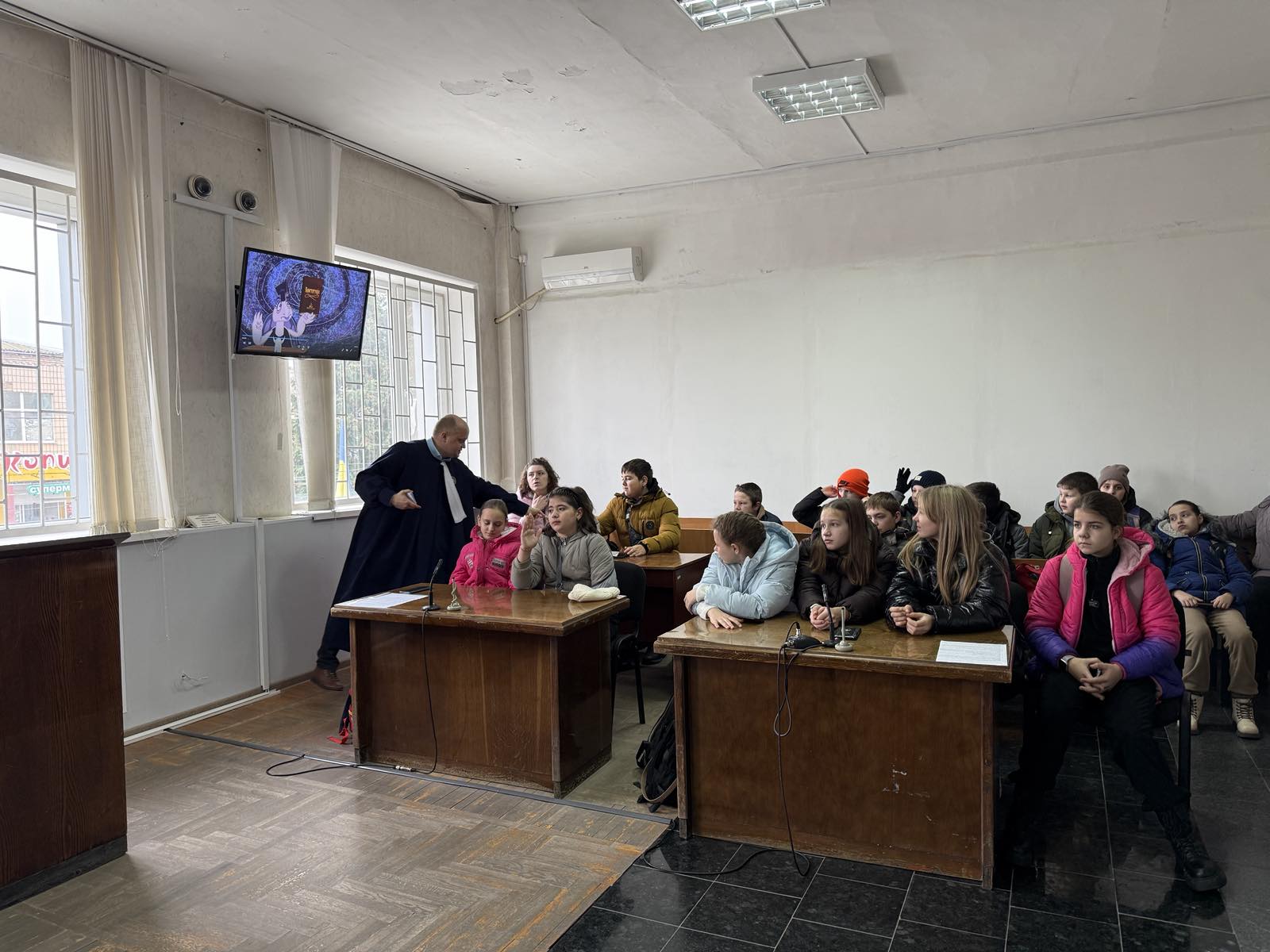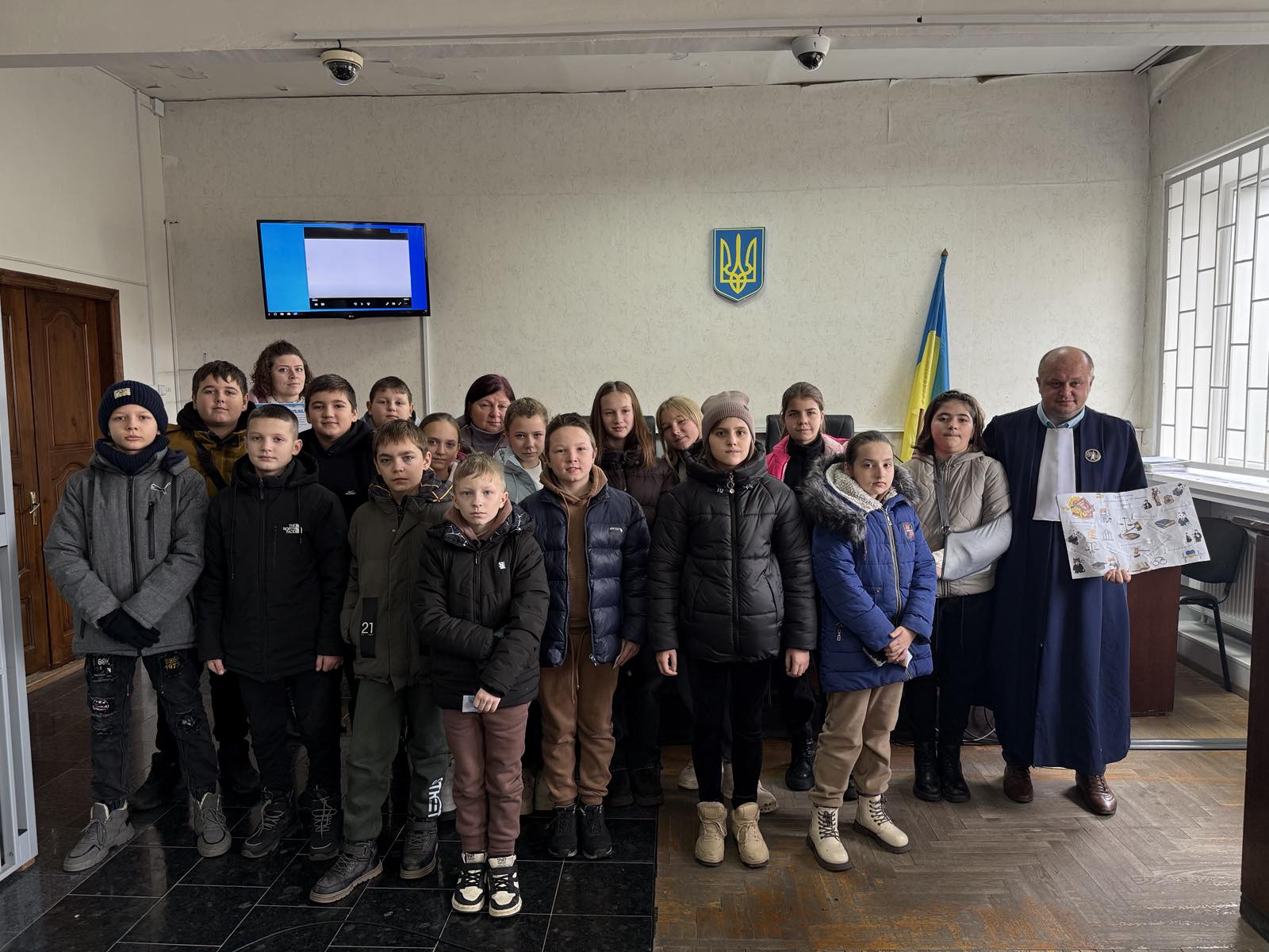 Також, під час уроку діти переглянули яскравий мультфільм «Слон проти Жирафи» та спробували себе в ролі суддів. Мультфільм змальовує, що усі різні і у кожного є різні природні можливості та інтереси, тому між ними можуть виникати суперечки, і для вирішення спору потрібен суд! Діти зрозуміли, що на суддю покладається велика відповідальність - бути справедливим! Слухачі активно приймали участь у інтерактивній грі-дискусії та отримали в подарунок яскраві наклейки і Диплом за участь у Всеукраїнській акції «Урок справедливості».