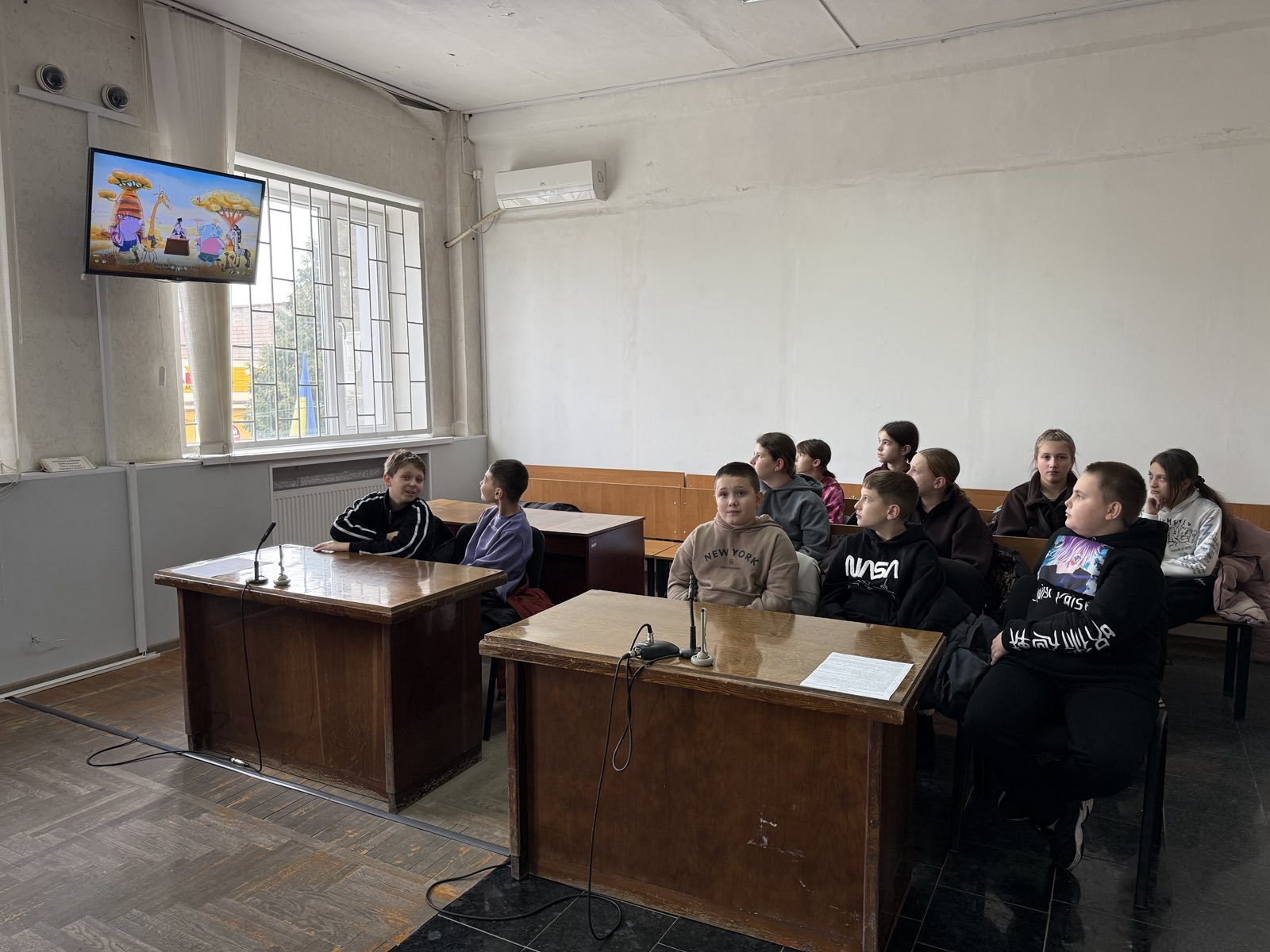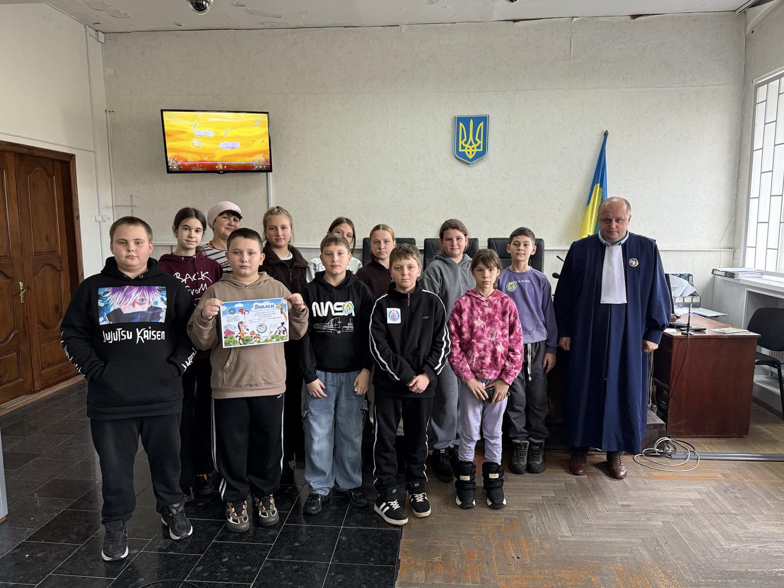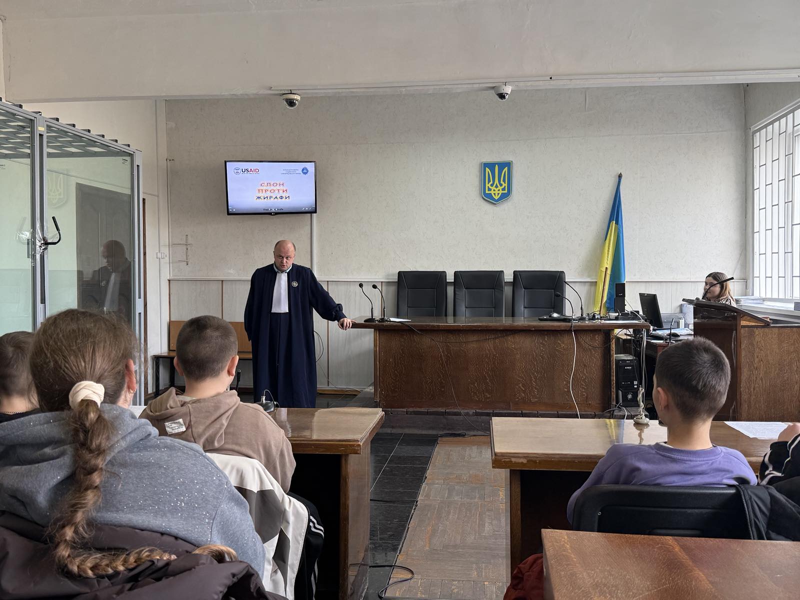 Також, під час уроку діти переглянули яскравий мультфільм «Слон проти Жирафи» та спробували себе в ролі суддів. Мультфільм змальовує, що усі різні і у кожного є різні природні можливості та інтереси, тому між ними можуть виникати суперечки, і для вирішення спору потрібен суд! Діти зрозуміли, що на суддю покладається велика відповідальність - бути справедливим! Слухачі активно приймали участь у інтерактивній грі-дискусії та отримали в подарунок яскраві наклейки і Диплом за участь у Всеукраїнській акції «Урок справедливості».